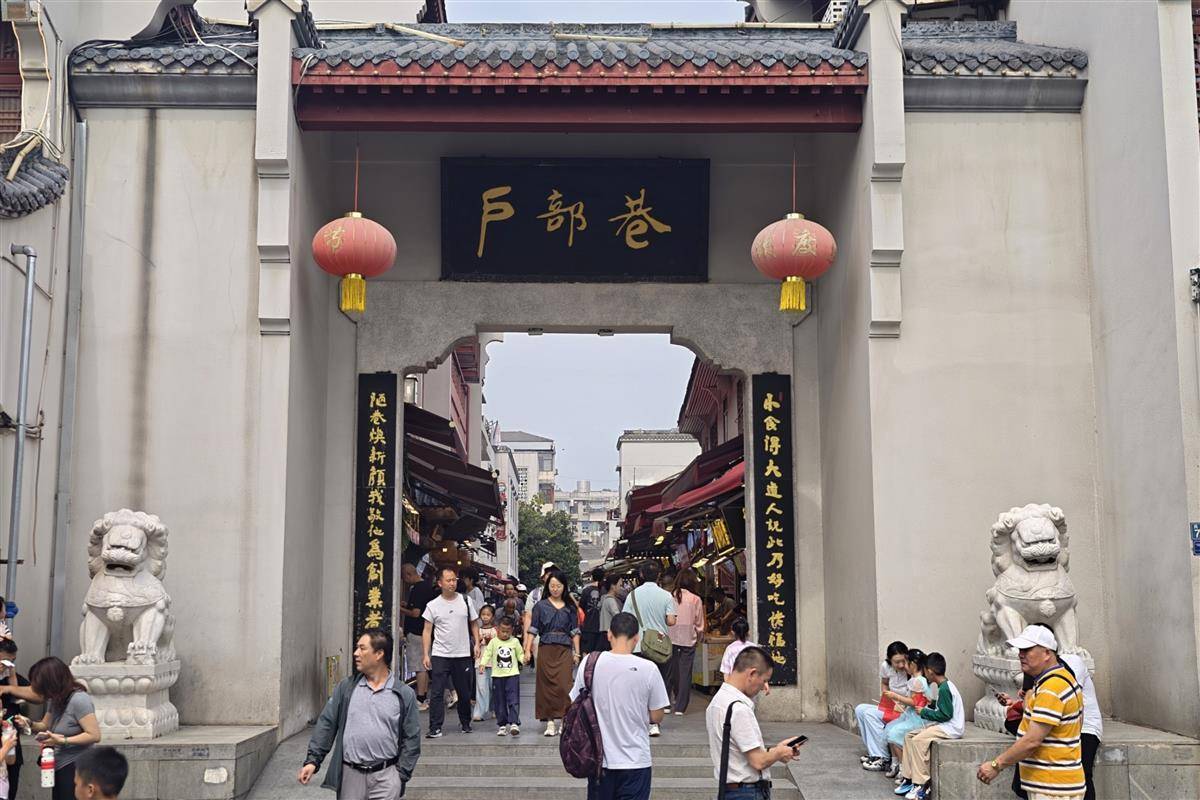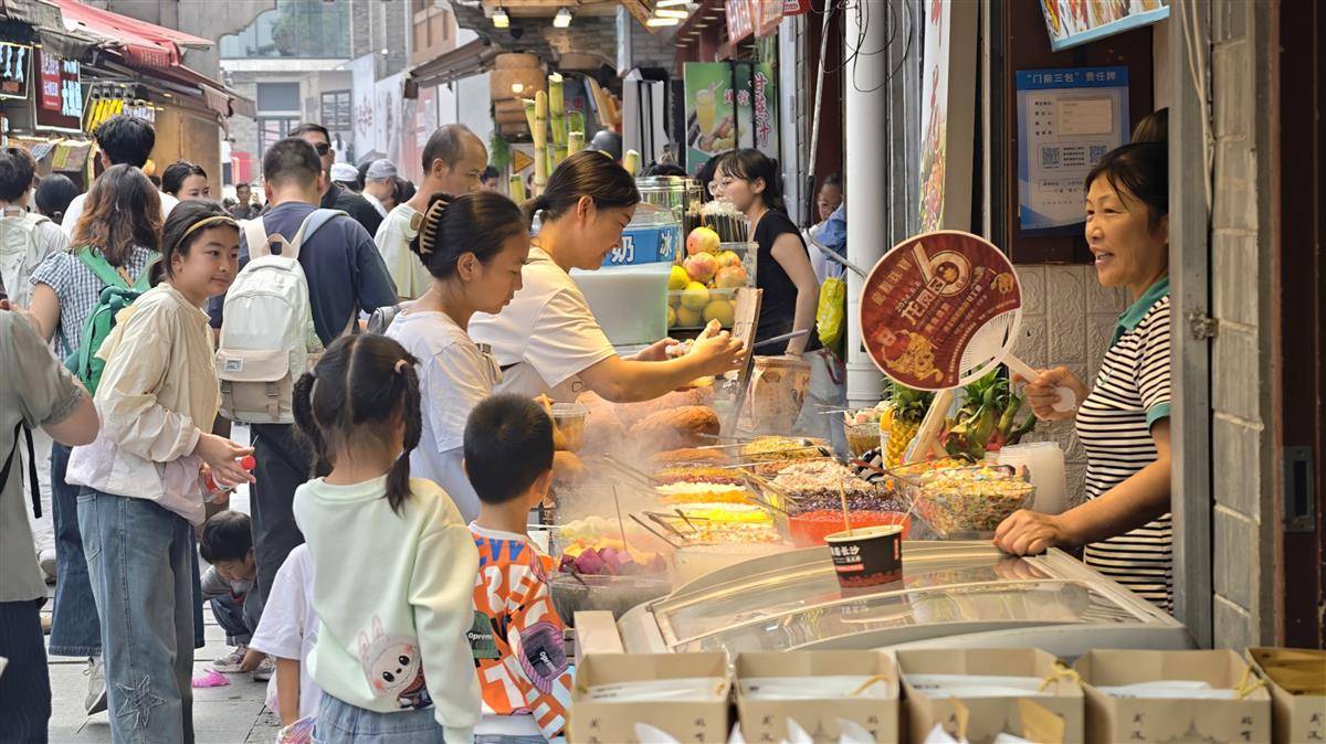 10月1日國慶節,武漢百年老巷戶部巷成熱門打卡點。巷內游客摩肩接踵,排隊品嘗各種漢味特色美食。煙火氣濃厚的攤位間,笑聲與香氣交織,凸顯湖北美食的獨特魅力。(湖北日報全媒記者 陳少哲 攝)