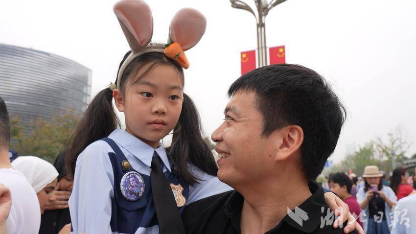 他們二年級的女兒特意穿上了自己最心愛的裙子,裙擺像一朵盛開的鮮花。她牽著父母的手,隨著人流匯入高新大道那片逐漸沸騰的紅色海洋。爸爸用堅實的臂膀,為女兒架起了“全場最佳觀景臺”。當氣勢恢宏的花車與歡騰的非遺方陣緩緩經過時,女兒坐在爸爸肩頭揮舞著國旗,眼睛亮晶晶的,仿佛盛滿了整個節日的星光。