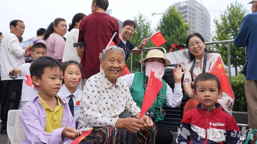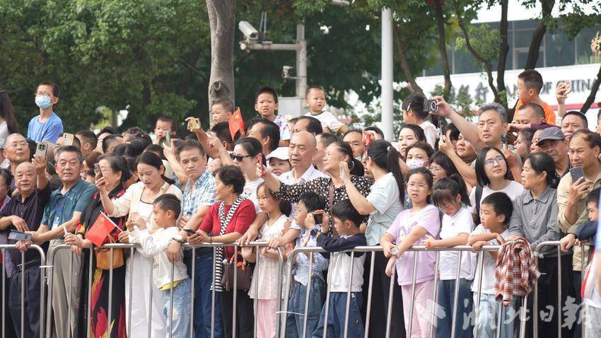同樣深情的還有呂美玲女士一家。為了這場盛會,呂美玲“總動員”。84歲的奶奶提前兩天就從老家被接到武漢,今天清晨,一大家人扶老攜幼,帶著3個孩子,其中最小6歲,一行8人搬著小板凳早早占據了最佳觀賞位。奶奶精神矍鑠,當《洪湖赤衛隊》《紅色娘子軍》等經典旋律響起時,她眼中泛著淚光,仿佛回到了那段崢嶸歲月。