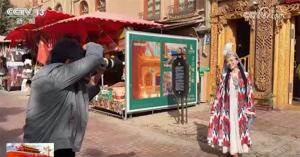 在新疆喀什古城景區,這幾天每天都舉行開城儀式,迎接來自全國各地的游客。古城街巷里更是掛滿了國旗,讓人們感受到濃濃的國慶氛圍。 景區人氣火爆也帶來商業機遇,身著民族傳統服飾的游客隨處可見,旅拍攝影師則在一旁記錄。