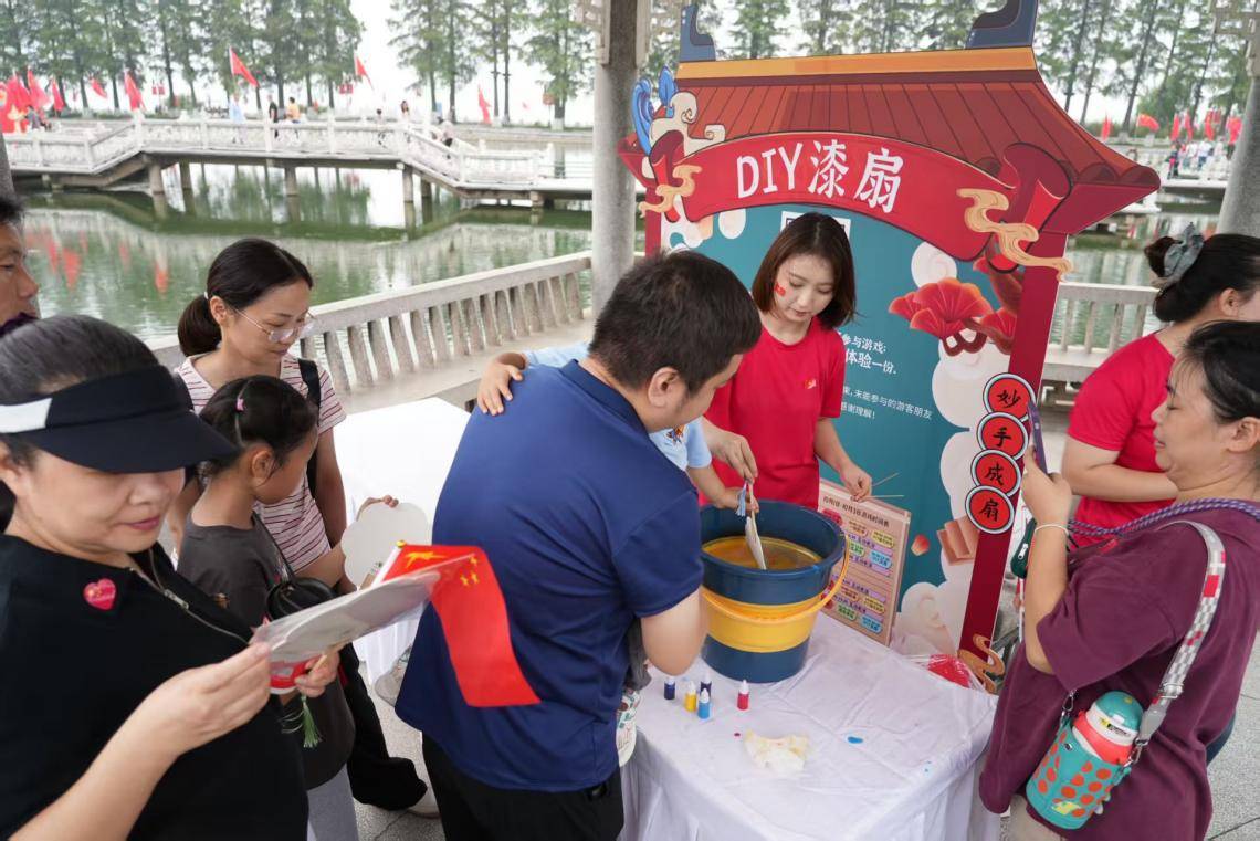 10月1日—3日,在碧潭觀魚舉辦的聽濤游園會成為假期里的歡樂焦點。漆扇制作區,家長與孩子們共同協作,在漆扇上描繪心中的國慶圖景;投壺區喝彩聲陣陣,游客們在投擲與命中的樂趣中,切身感受傳統游藝歷久彌新的獨特魅力;懸掛挑戰區圍滿了年輕人,參與者雙手自然懸掛,堅持60秒即可獲得東湖之眼摩天輪門票,成為現場最具人氣的挑戰項目;眼疾手快的游戲則考驗著游客的反應能力。