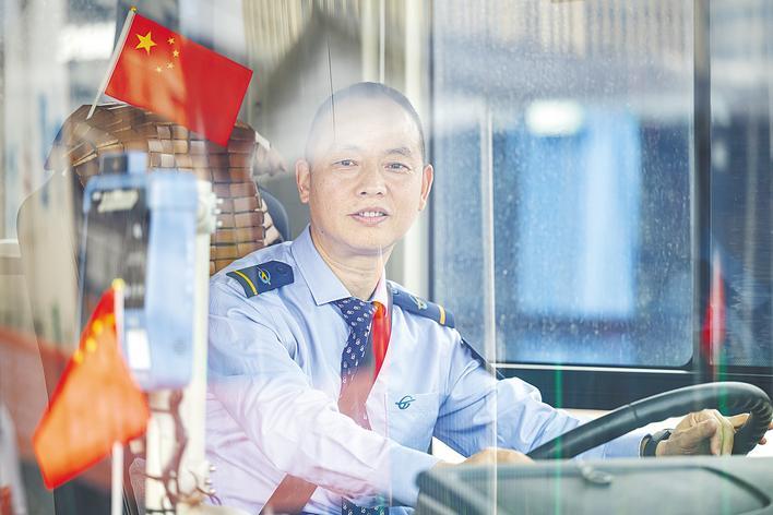 武漢公交553路司機(jī)周?chē)?guó)慶,在駕駛室見(jiàn)證新中國(guó)的日新月異。(湖北日?qǐng)?bào)全媒記者 任勇 通訊員 廖瑜 張萌 攝)