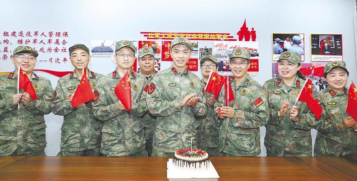 戰(zhàn)友們?yōu)槲錆h市青山區(qū)人武部劉慶(前左二)送上祝福,共度國(guó)慶。 (湖北日?qǐng)?bào)全媒記者 張鴻 通訊員 萬(wàn)臘華 徐楊 攝)