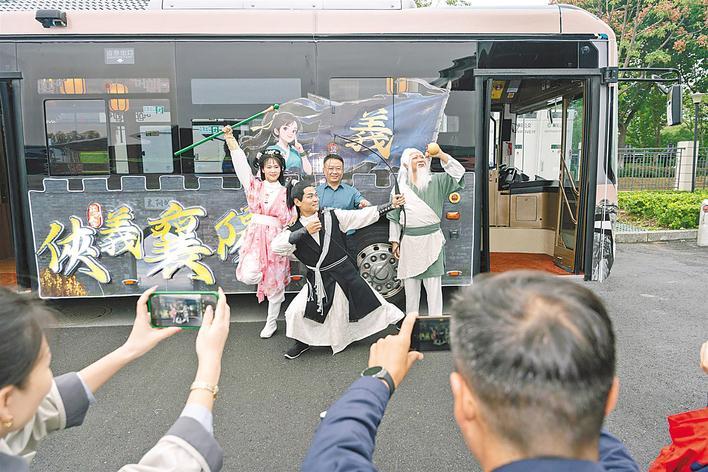 “郭靖”化身公交司機,“黃蓉”在車廂內翩翩起舞,沉浸式乘車體驗讓游客大呼過癮……10月1日,“俠義襄陽”旅游公交車從襄陽新能源汽車公園駛出。該主題公交將襄陽歷史文化與金庸武俠元素巧妙融合,車廂內不僅裝飾有燈籠、戰鼓等武俠風道具,還營造出濃厚的江湖氛圍。襄陽市公交公司介紹,該公交途經諸葛亮廣場、白馬廣場等核心地標,國慶期間,游客可免費乘坐體驗。