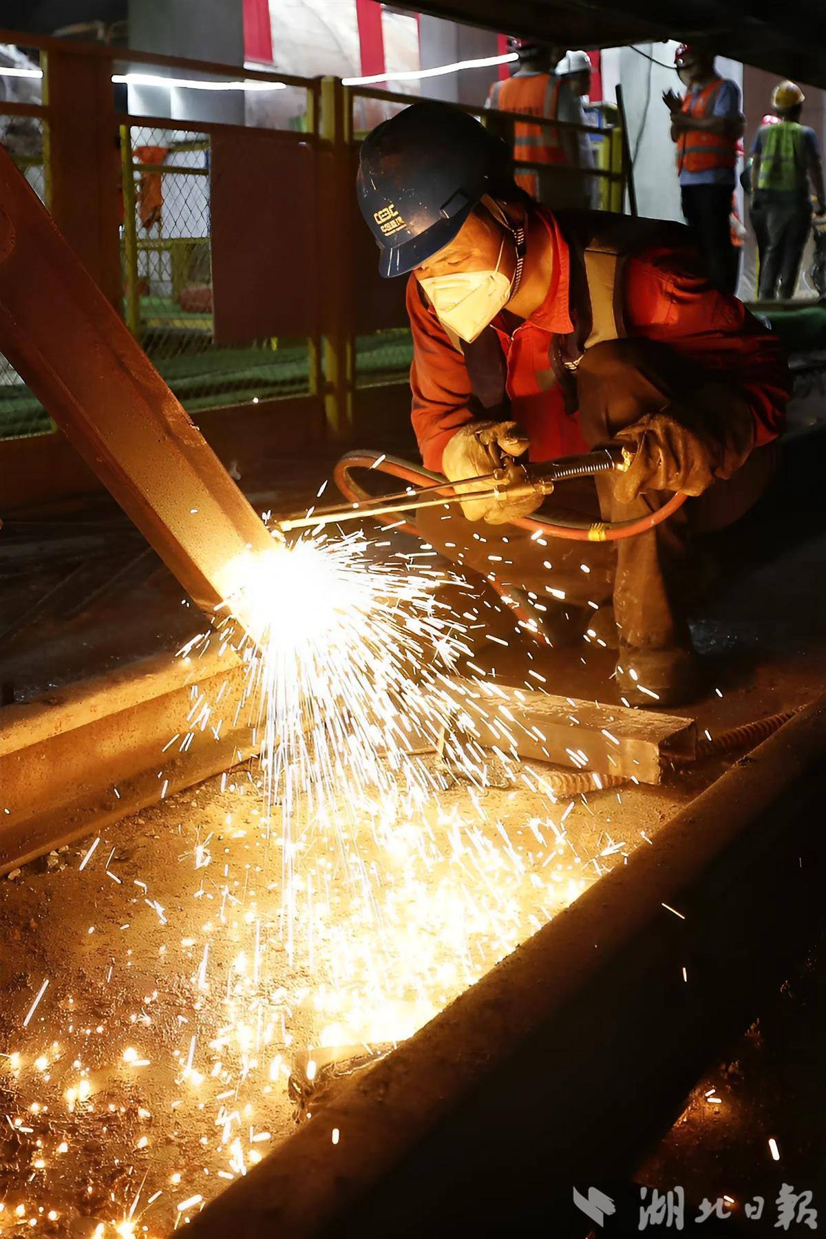 11號線四期,地下20余米深的四新大道站至芳草路站區間,兩臺盾構機已吊裝下井,即將始發,作業人員抓緊進行刀盤組裝和調試,焊花四射,秩序井然。