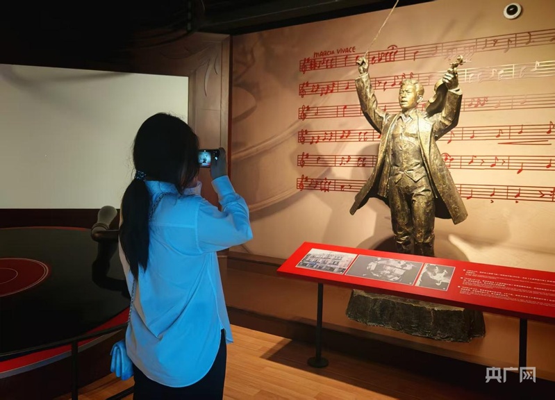 “我家過去就住在這樓上?!崩宵h員施榮貴指著展館,語氣里帶著幾分自豪。他是國歌展示館的“老熟人”,拆遷后這里建起展館,他?;貋砜纯础Kf,每次來都能感受到一種沉甸甸的力量。