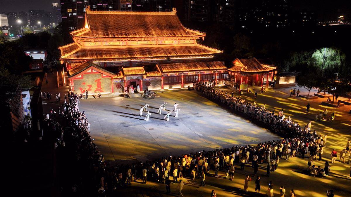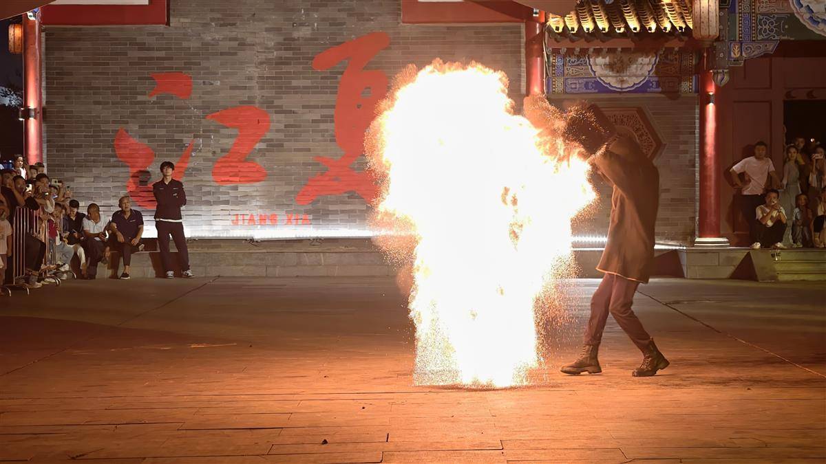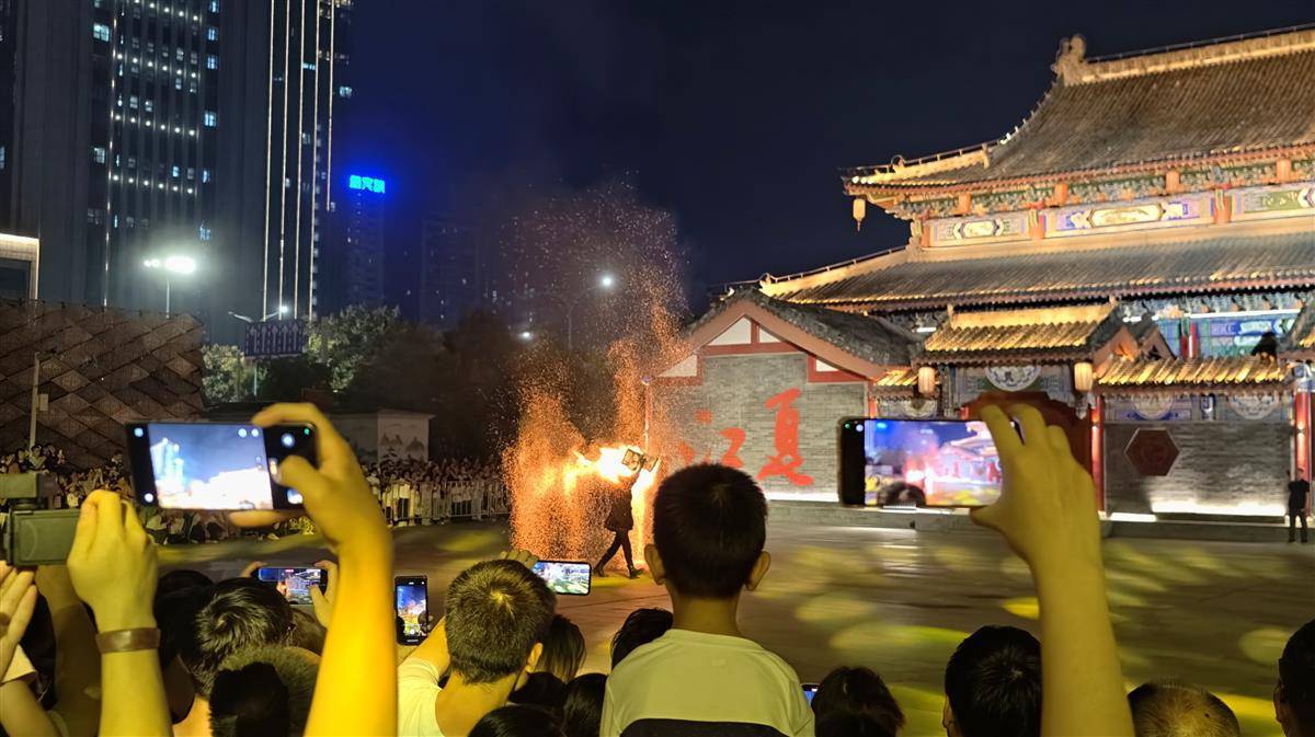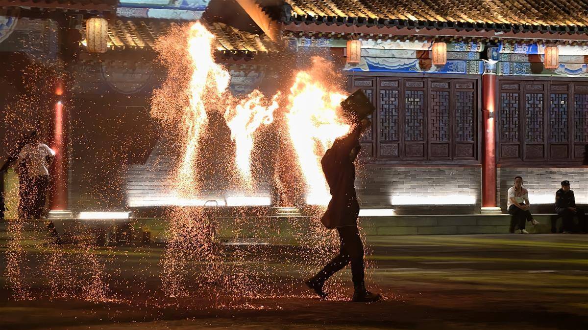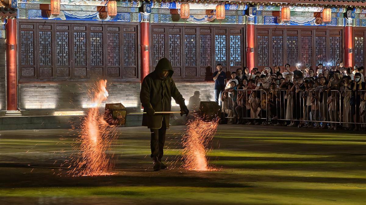 夜幕降臨,戲樓前非遺傳承人手持火壺,演繹“鐵火流光”絕技。火花如星河傾瀉,四濺飛舞卻秩序井然。驚險與安全并存的表演瞬間引爆全場,絢麗光影將夜游氛圍推向高潮,盡顯傳統藝術的魅力。(湖北日報全媒記者 陳少哲 攝)