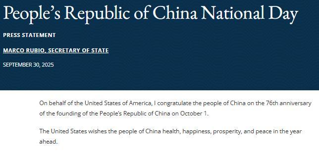 根據美國國務院網站當地時間9月30日消息,美國國務卿魯比奧發表簡短聲明:我謹代表美利堅合眾國,就中華人民共和國成立76周年表示祝賀。