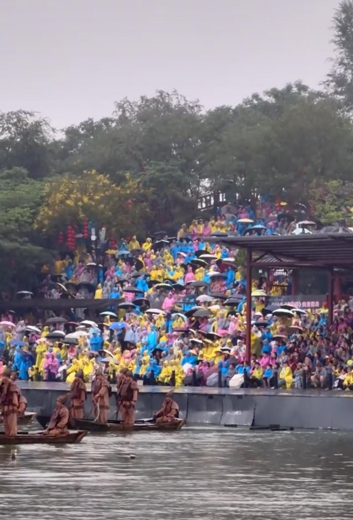 2日上午,該園工作人員告訴記者,游客進園之后,在門口可以免費領取雨衣,正常是穿不破的,這個雨衣沒有打LOGO,“太多了,現在印不上。”問及為何想到免費發放,該工作人員表示:“下雨為顧客發放雨衣,提供必要的幫助是應該的。”在2日的景區直播中,極目新聞記者注意到,觀眾臺上不少游客都穿著景區發放的雨衣觀看表演。