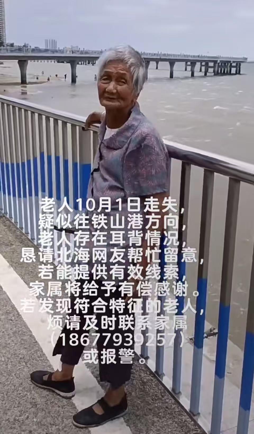 10月1日,廣西北海大浪頭村88歲的鐘奶奶,在自家附近遛彎時不慎走失。10月2日,鐘奶奶的孫女向記者透露,老人走失時身著黑色褲子與粉色上衣,家人目前正焦急尋找。