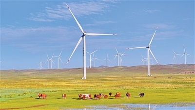 內蒙古自治區烏蘭察布市,風力發電機將風能轉化為綠色電能。