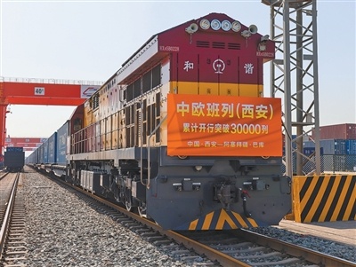 陜西省西安市,滿載光伏組件的中歐班列從西安國際港站駛出。