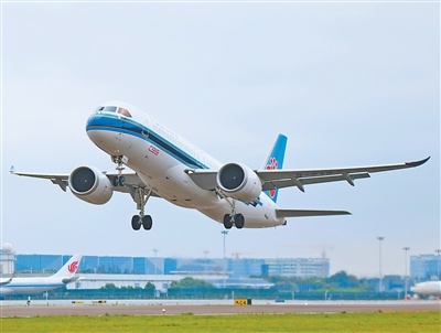 浙江省杭州市,南航國產C919客機從蕭山國際機場起飛,飛往廣東廣州。C919實現從首飛到首航,再到常態化商業運營,目前累計獲得國內外訂單超1000架。