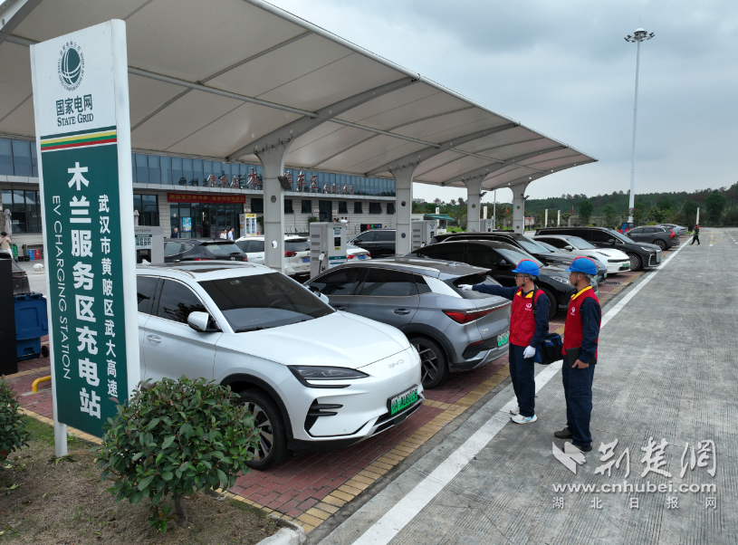 在G0424武大高速木蘭停車區的國家電網充電站里,4臺快充的充電樁已“滿員”,國網武漢供電公司定點服務人員正根據8支充電槍的狀態進行有序引導,協助車主充電。