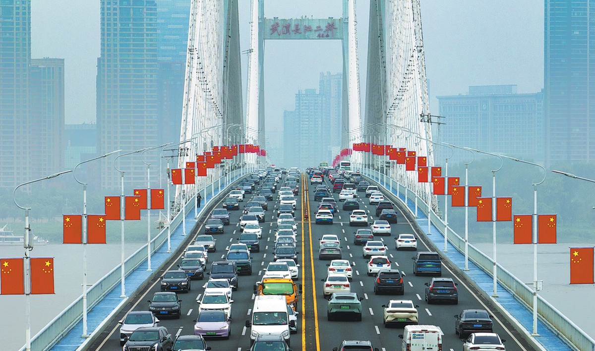 Vehicles cross the Second Yangtze River Bridge in Wuhan, Hubei province, on Wednesday, the first day of the National Day holiday, with various places experiencing peak travel traffic. XIAO YIJIU/XINHUA