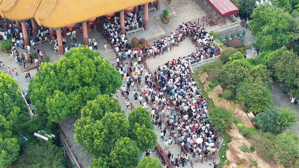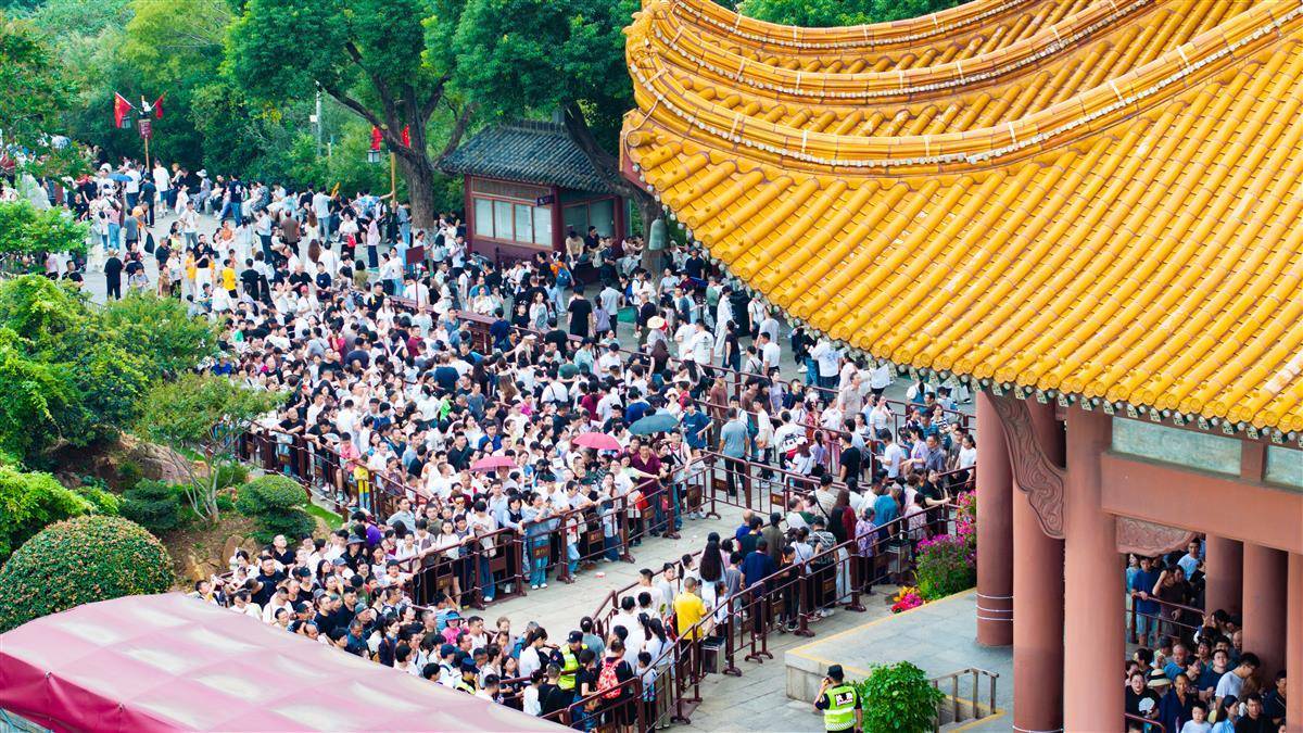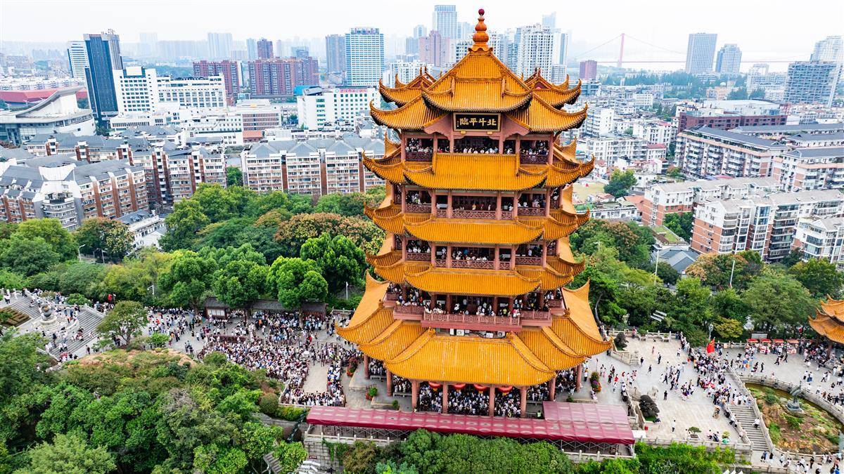 2025年10月2日,“十一”小長假第二日 ,在武漢黃鶴樓景區,大批游客有序排隊快速通過景區設立的緩沖區,登頂黃鶴樓,一覽武漢兩江四岸的壯美風景。今年“十一”小長假,黃鶴樓景區全員上崗,優化游覽動線,做好游客引導等各項服務,全力讓游客少排隊、不排隊,暢快游玩,享受快樂假期。(湖北日報全媒記者 何宇欣 攝)