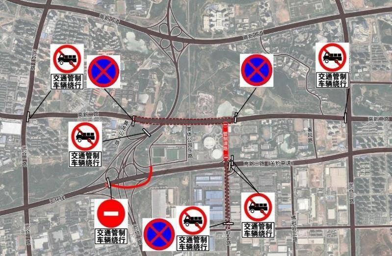 佛祖嶺一路(高新二路至流芳園橫路)、高新二路(光谷一路至光谷三路):全天禁止大型貨車及危化品運輸車輛通行;