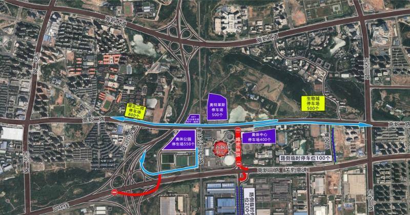 西向東方向來車:可停靠奧體公園地下停車場(550個)、奧體中心360停車場(400個);