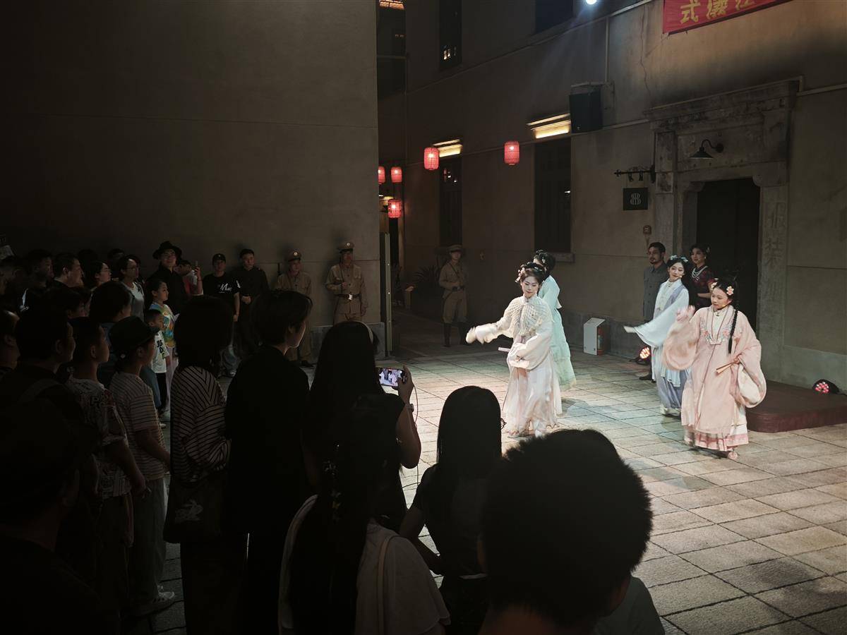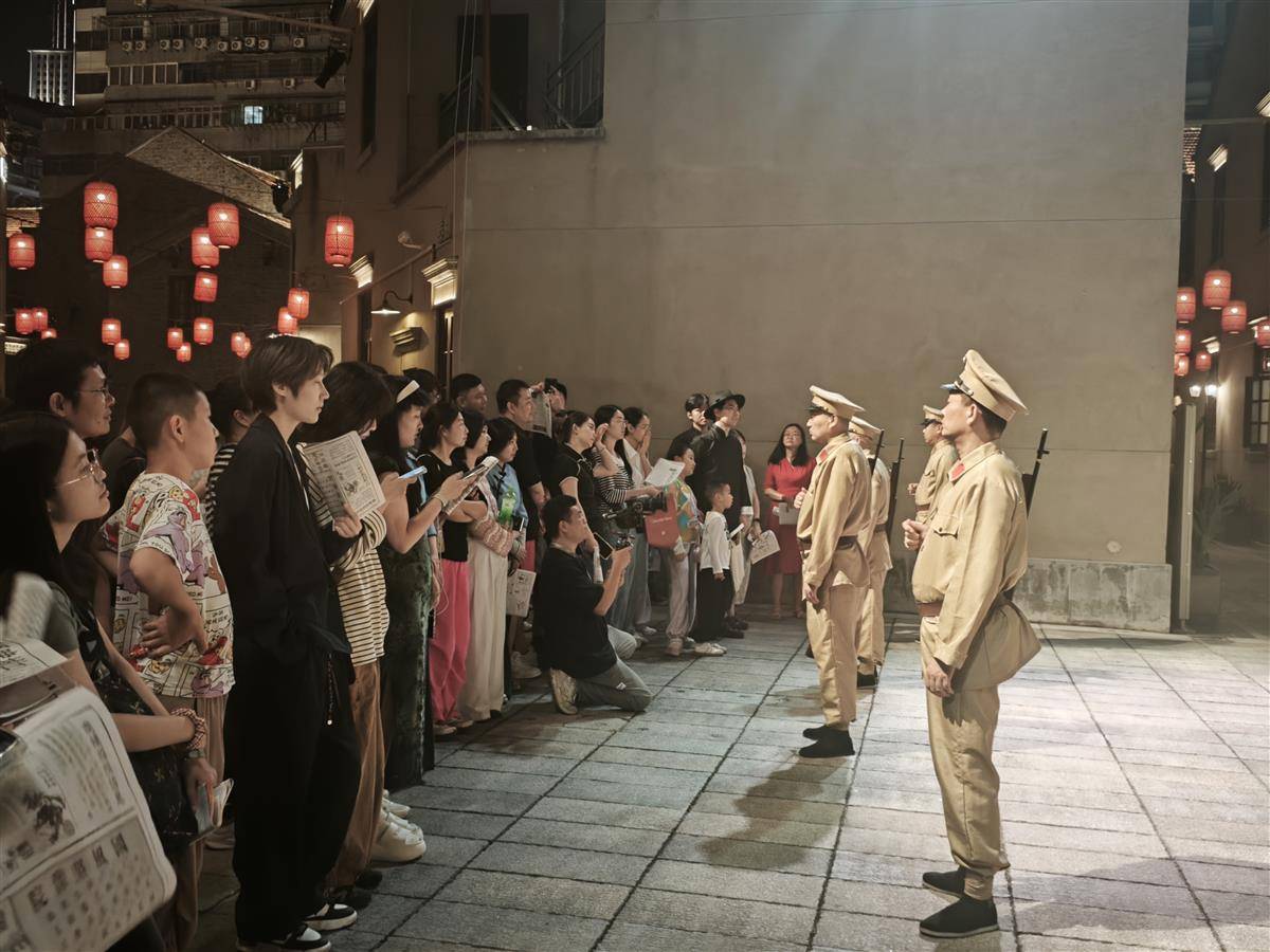 沉浸式文娛劇《保元風云》去年9月30日首次亮相,一年來演出300多場,接待觀眾3萬多人次。該劇的故事設定在國共聯合抗日的歷史背景下,以“江城軍事布防圖”為線索,展現中國抗日熱血青年與敵對勢力的緊張博弈。主線與副線共22名演員參與演出,與傳統的觀演模式不同,觀眾不再靜坐席間,而是跟隨演員穿行于保元里的街巷之間,成為劇情的一部分。
