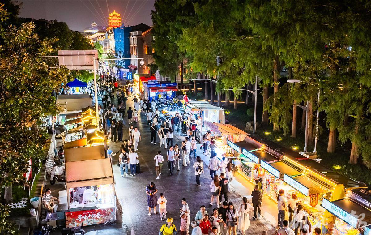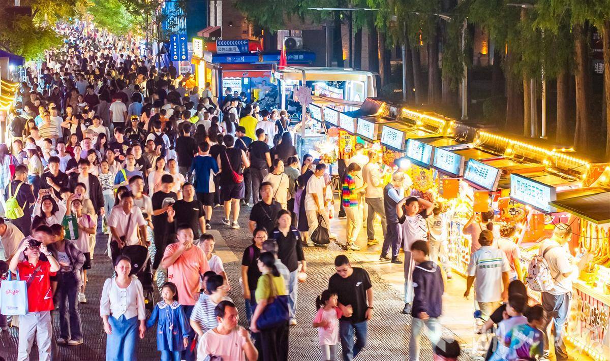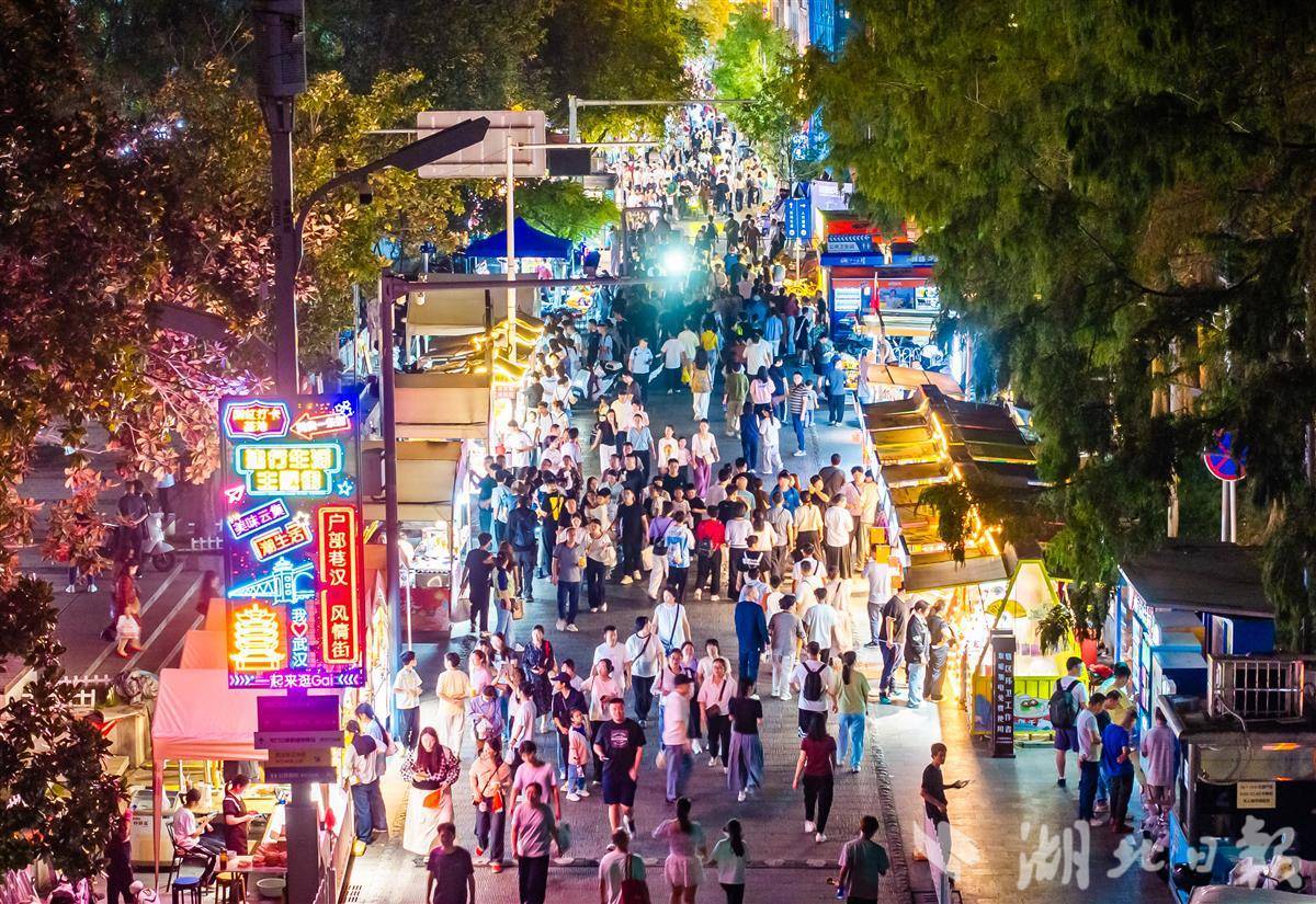 10月1日晚,武漢市武昌區斗級營歷史文化街區,游客絡繹不絕。國慶假日期間,武漢夜間消費場景升級,打造“游購娛食”一體化夜游體系,吸引眾多消費者,“夜間經濟”活力滿滿。(湖北日報全媒記者 薛婷 攝)