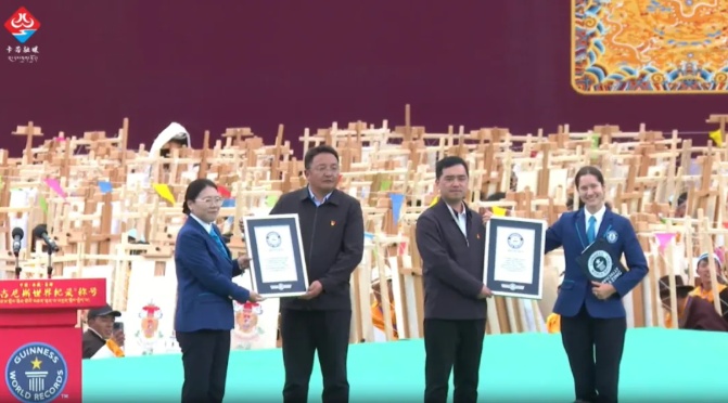 隨后,吉尼斯世界紀(jì)錄官方向參加挑戰(zhàn)活動的昌都市唐卡各畫派代表頒發(fā)了“吉尼斯世界紀(jì)錄保持者”證書!新的世界紀(jì)錄是1138人,在成功打破原世界紀(jì)錄1005人的同時,還創(chuàng)造了“最大規(guī)模唐卡課程”新的世界紀(jì)錄!