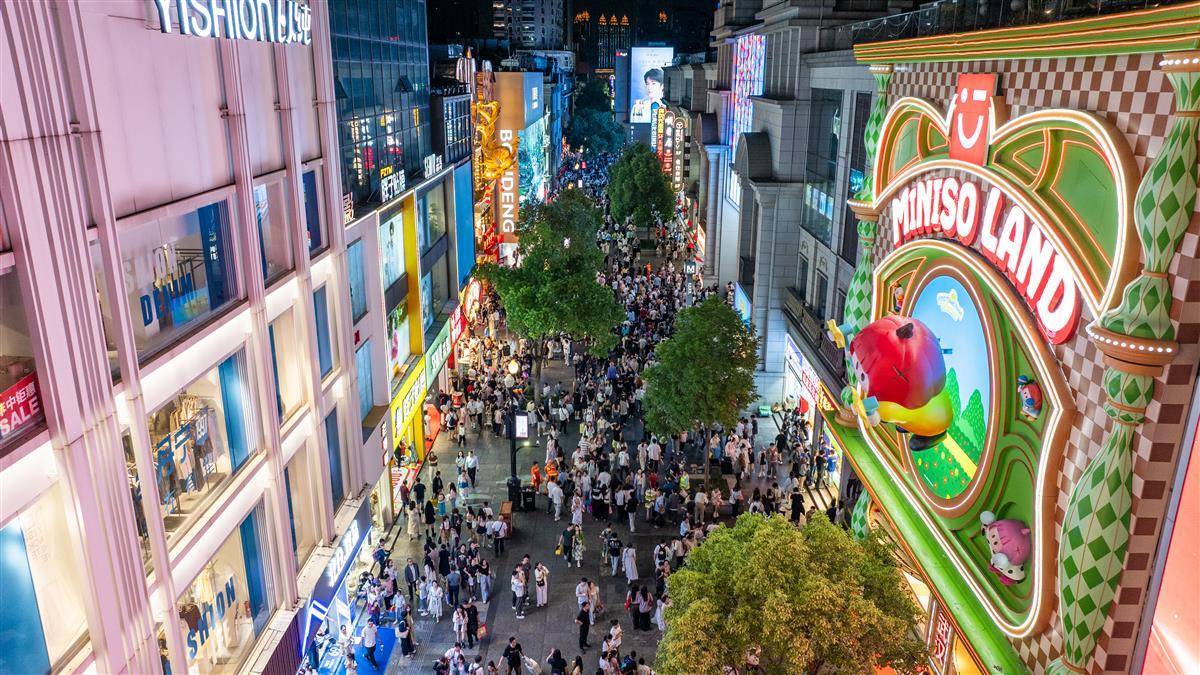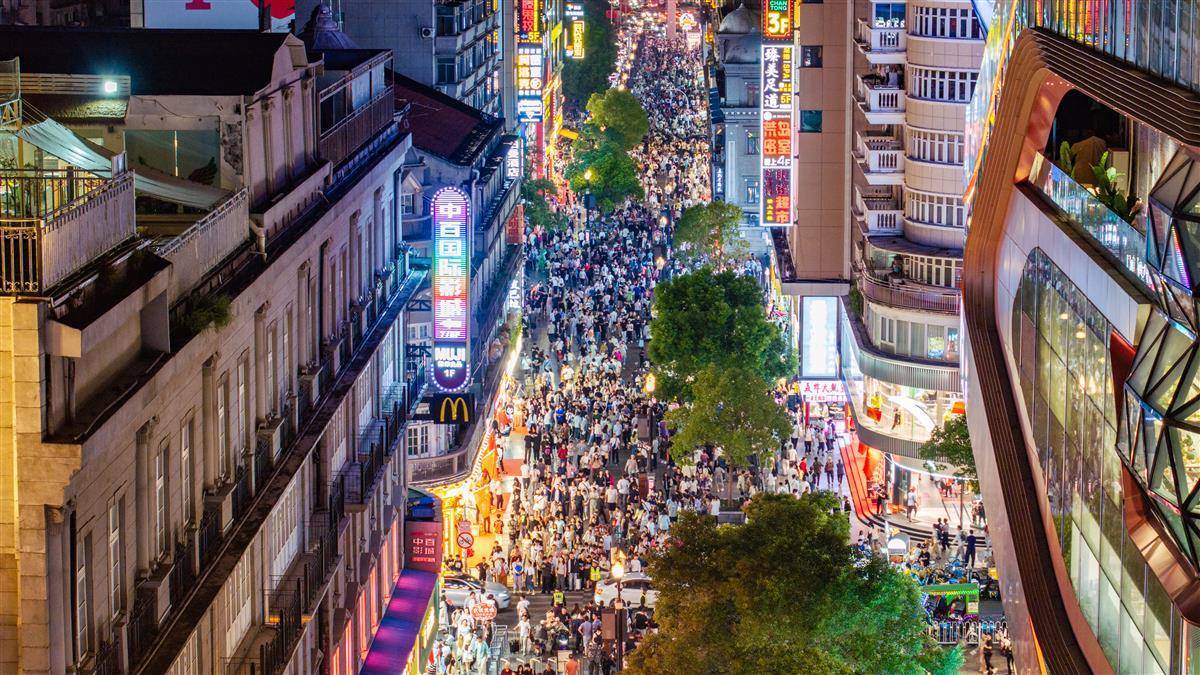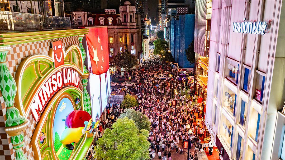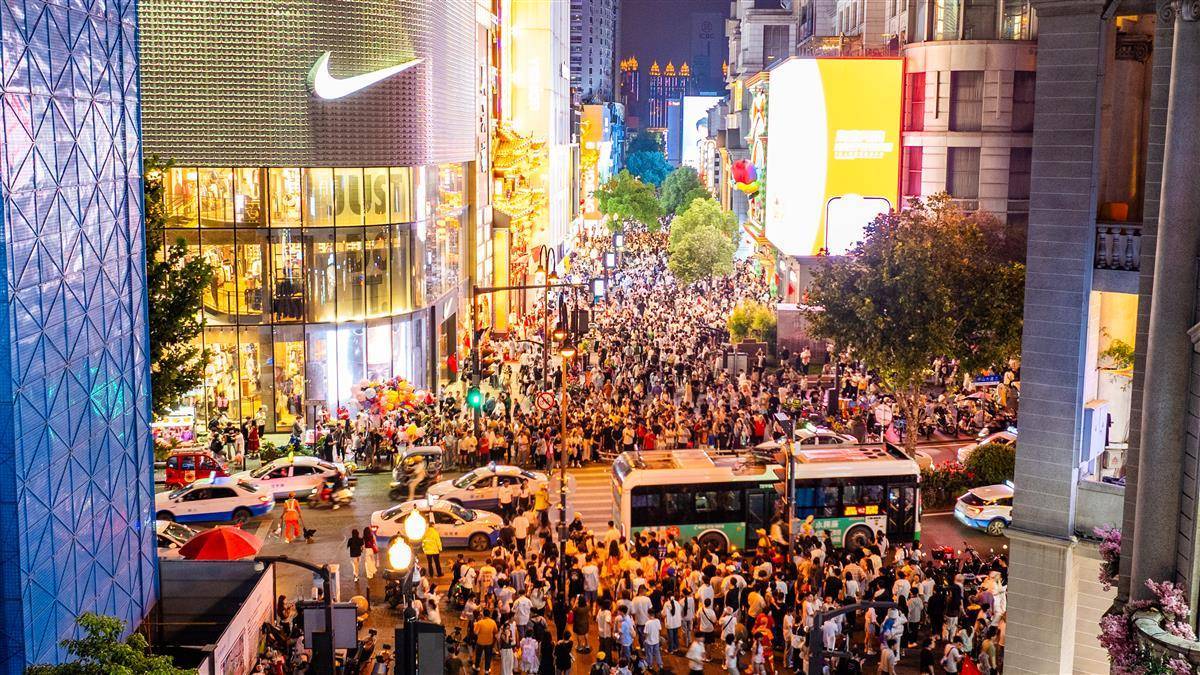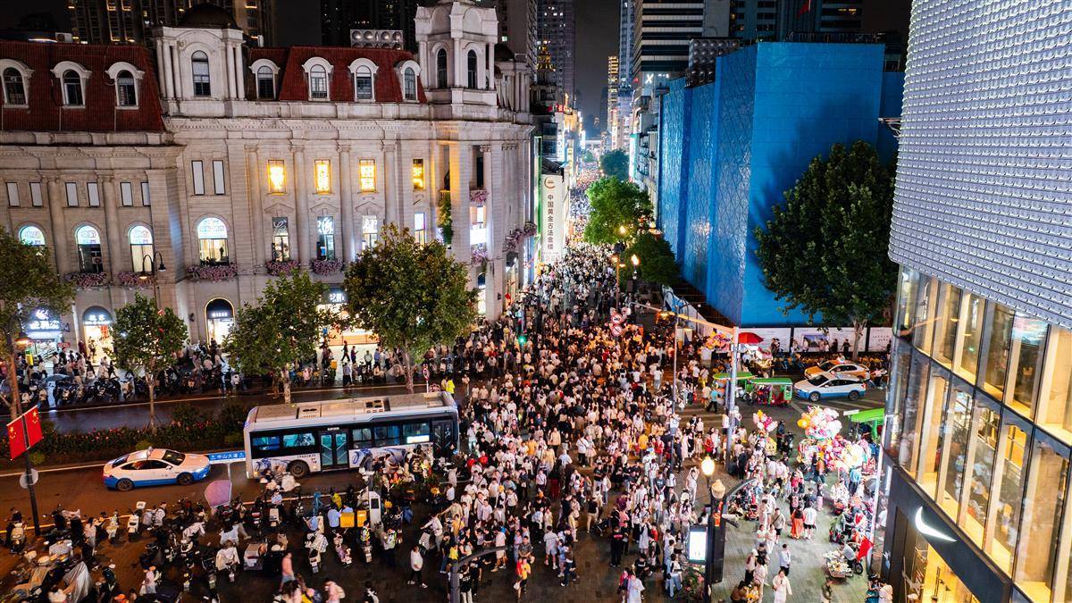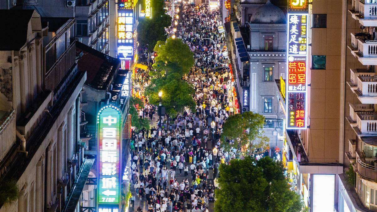 2025年10月2日,“十一”小長假第二日 ,大批市民游客晚上走進武漢市江漢路步行街,川流不息的人群一眼望不到頭。(湖北日報全媒記者 何宇欣 攝)
