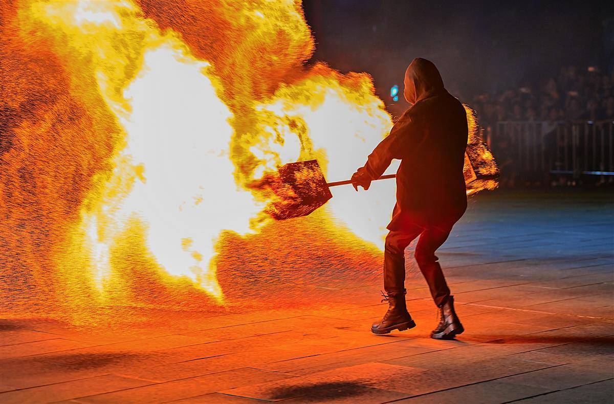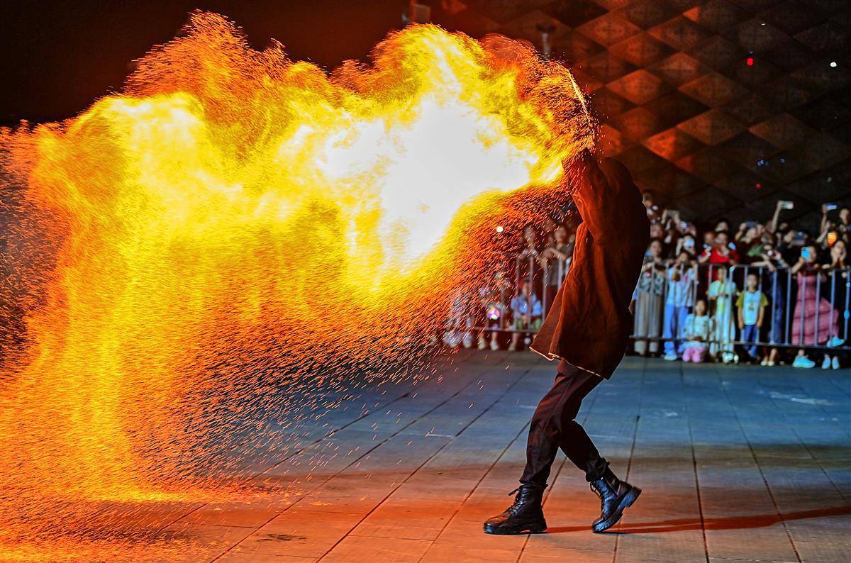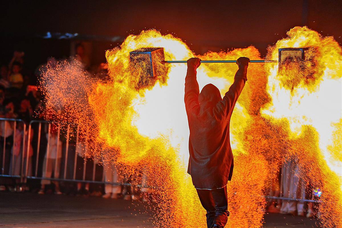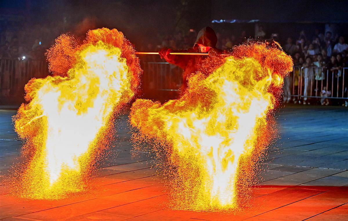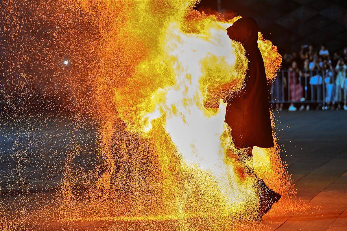 10月2日晚,武漢江夏區譚鑫培公園戲樓廣場上,一青年男子的中國非遺火壺表演,火樹銀花場面震撼引發關注。表演者將燒好的木炭放入兩邊的鐵網,通過抖動產生火花,現場一片火樹銀花。據悉,火壺表演是國家級非物質文化遺產之一,寓意驅疾避禍,百家安寧。(湖北日報全媒記者 朱熙勇 攝)