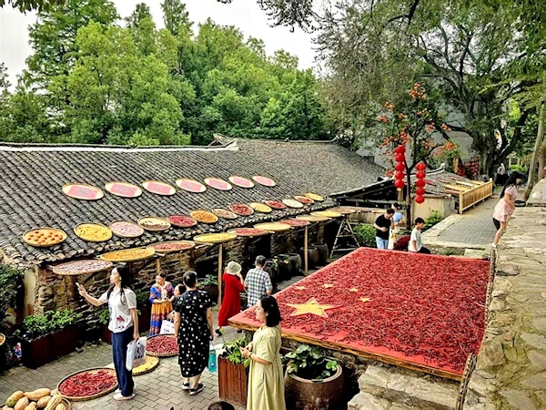 10月1日上午10時,剛入村口,就被屋頂曬臺上的盛景撞個滿懷——1500個玉米搭建的豐收垛直抵檐角,1314個玉米編織的愛心屋藏著浪漫寓意,南瓜與紅辣椒堆疊的豐收塔在陽光下熠熠生輝。沿著新修的300米木棧道登高遠眺,中央街屋頂、后街曬秋場、智慧泉畔的曬匾層層疊疊,“五谷豐登”“風調雨順”的主題布景與明清馬頭墻相映成趣,連青石板路旁的石臼里都曬滿了橙黃的柿子,隨手一拍都是秋日大片。