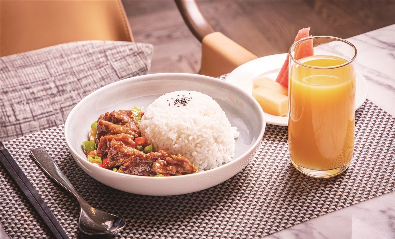 “我們的午市套餐自今年3月起開始推出,分為面條和米飯2種,分別為28元和38元一份。”武漢襄投萬豪酒店臻廚全日制餐廳經理張文倩介紹,米飯套餐如小炒黃牛肉、青椒肉絲、土豆肉絲等,還有豉油雞、叉燒飯等;面條套餐里則有襄陽牛肉面、肥腸面、武漢牛肉熱干面等4種主食,每款套餐均提供飲品、例湯和水果。