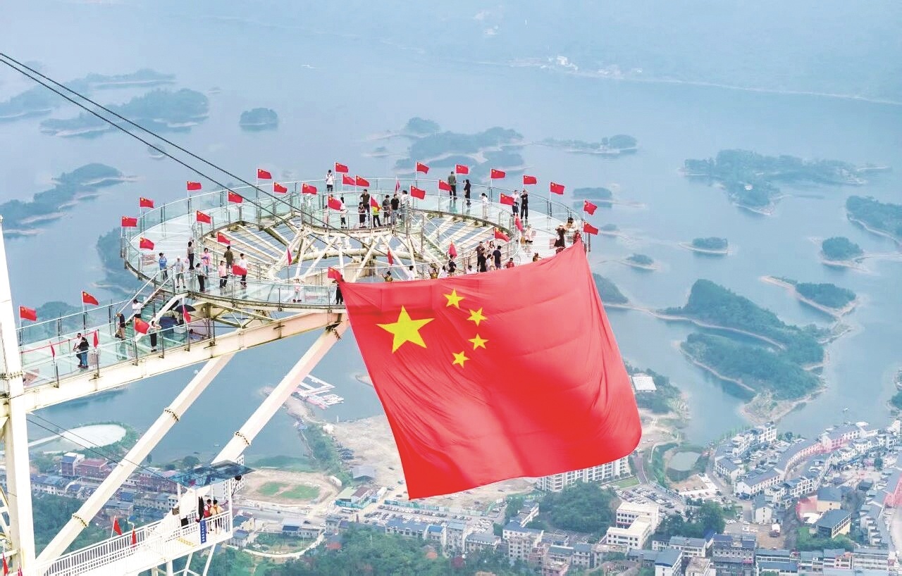 10月1日,陽新天空之城景區(qū)游人如織。在海拔520.1314米的天空之鏡玻璃觀景平臺(tái)上,20米巨幅國(guó)旗迎風(fēng)飄揚(yáng),國(guó)風(fēng)大鼓奏響節(jié)日的樂章,游客們齊唱國(guó)歌,留下對(duì)祖國(guó)最美好的祝愿。 楚天都市報(bào)極目新聞通訊員石勇 周巍 鄢巍攝