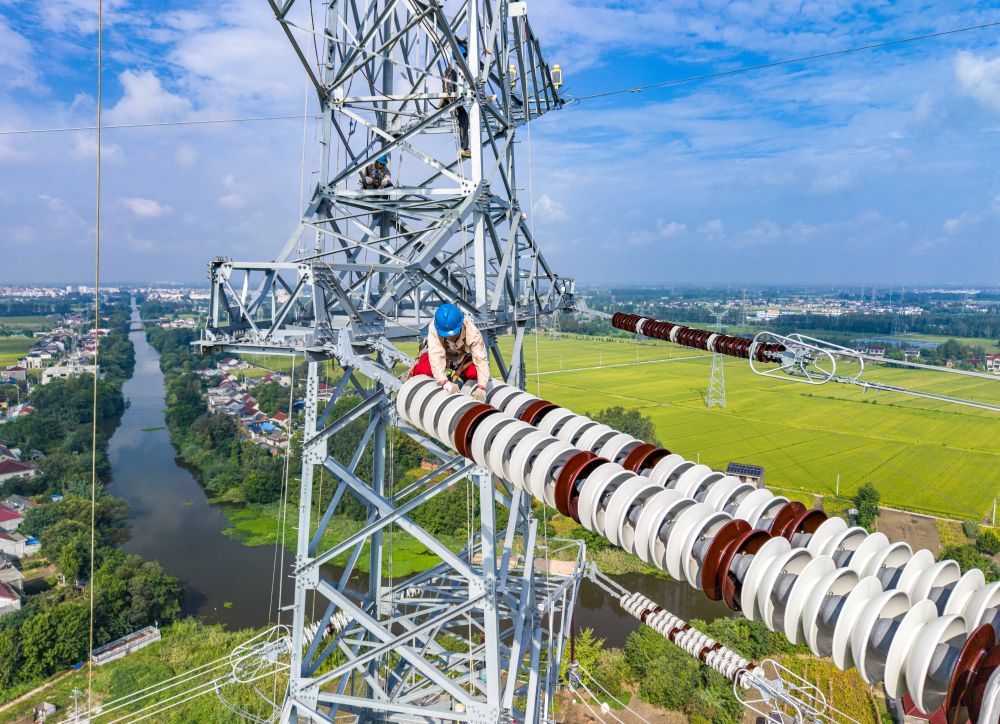 10月1日,電力人員在揚州-鎮江±200千伏直流輸電二期工程施工現場作業(無人機照片)。新華社發(任飛攝)