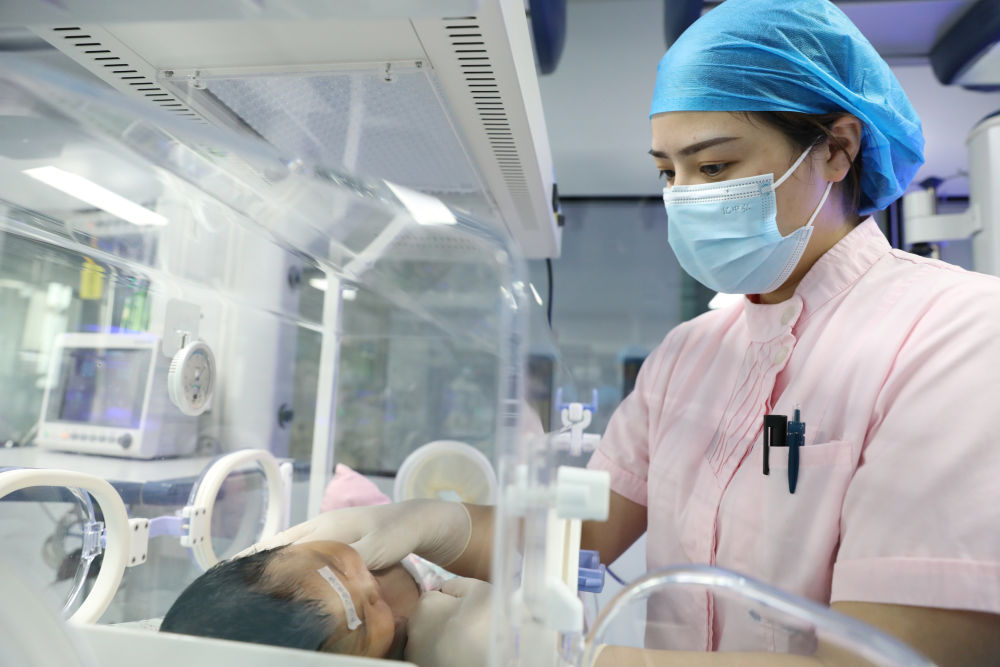 10月1日,河南省焦作市溫縣婦幼保健院護士在給新生兒做護理。新華社發(徐宏星攝)