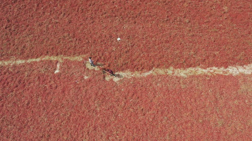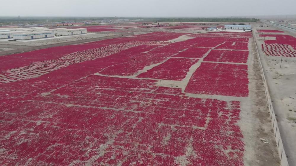 在距離沙灣市數百公里外的焉耆縣,14萬畝辣椒進入了采收晾曬的關鍵期。戈壁曬場被火紅的辣椒鋪滿,遠遠望去,宛如給大地鋪上了一層紅色的地毯。農民沙尼亞·艾海提今年種植了600畝辣椒,眼下正是她最忙碌的時候。