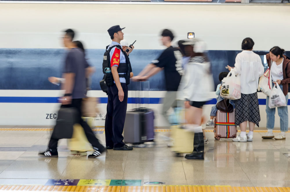 10月1日,武漢鐵路公安處武漢站派出所民警在武漢站巡查。 新華社發(趙軍攝)