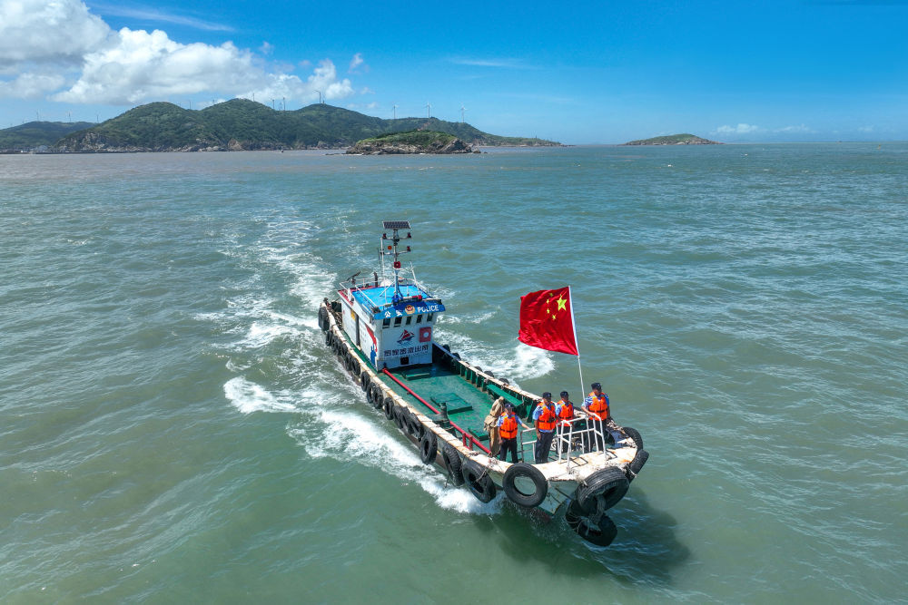 10月1日,浙江省舟山市岱山縣公安局羅家岙派出所民警開展海上巡查(無人機照片)。新華社發(鄒訓永攝)