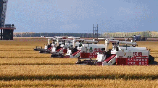 在黑龍江北大荒建三江七星農場,無人機跟隨多臺無人駕駛收割機,記錄正在進行中的秋收大會戰;在五常大米核心生產基地,穿越機飛越廣袤田野,稻穗編織成的“黃金毯”一覽無余,稻谷被整齊劃一地“吞”入農機“口中”,開啟這個豐收季沉甸甸的收獲。