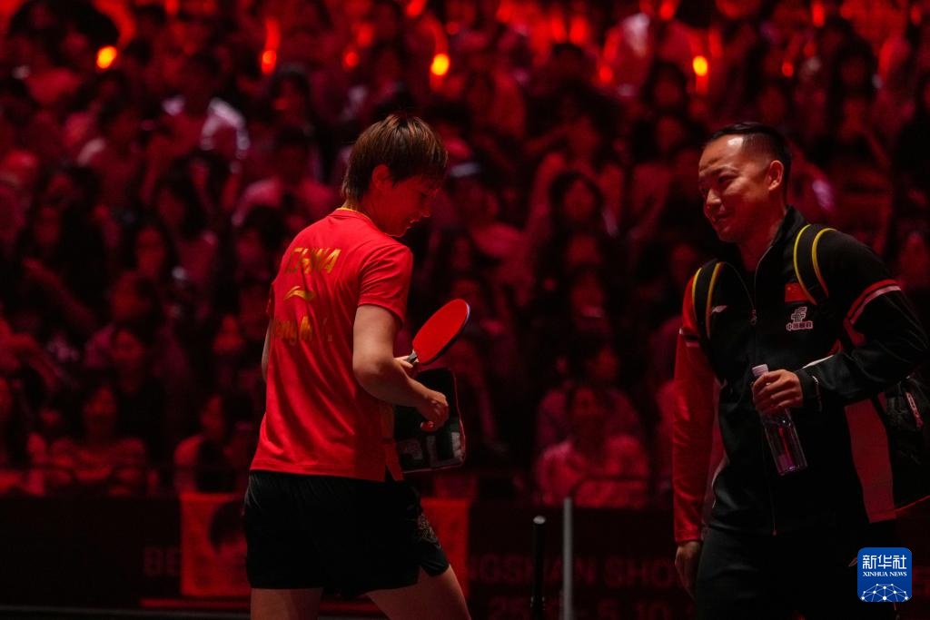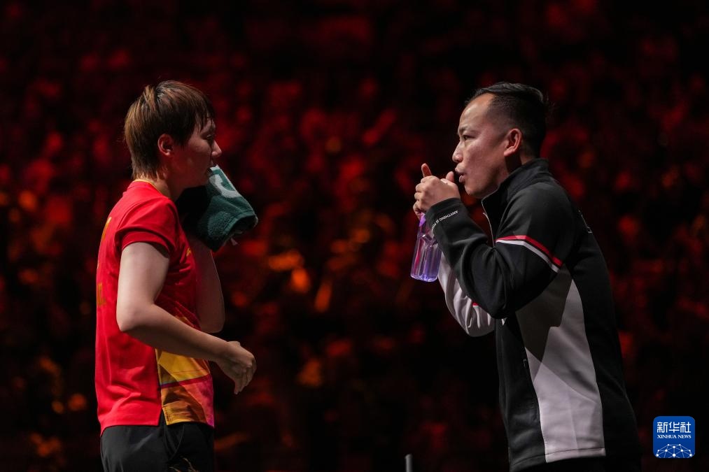 10月2日,王曼昱(左)在比賽中與教練任浩交流。