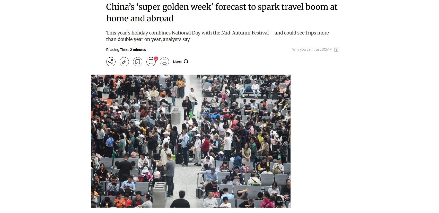 《南華早報》的報道稱,在本周開始的超長假期期間,一些免簽政策和中國國內高速免費預計將推動出游人數激增,這對服務業經濟是一個利好。報道還指出,今年的假期將國慶和中秋節結合在一起,旅游人數可能會比去年增加一倍以上。