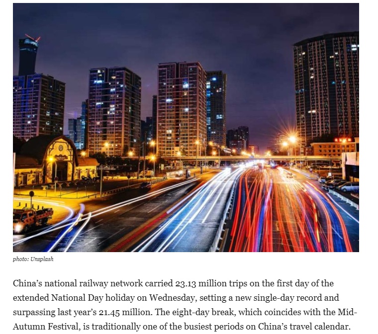 歐洲《現代外交》網站刊文指出,中國十一假期首日,全國鐵路網運送了約2313萬人次,創造了新的單日紀錄,超過了去年的約2145萬人次。文章稱,創紀錄的旅游人數被視為全球第二大經濟體消費需求和經濟健康狀況的晴雨表。