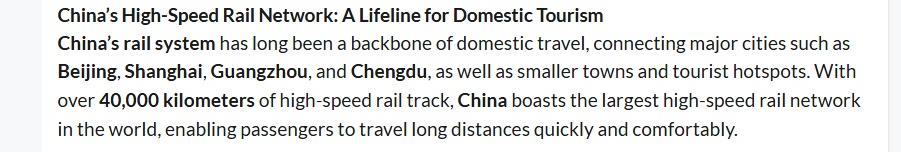 美國《旅行和旅游世界》網站刊文指出,隨著國慶假期的到來,中國國內旅游出現了歷史性的激增。中國龐大的高鐵網絡已成為不少國內旅行者的主要交通方式,鐵路預訂量創新高。該網站還發布旅行報告指出,鐵路預訂量的大幅增加標志著新冠疫情后中國旅游業的復蘇。高速鐵路系統在連接游客和熱門目的地方面繼續發揮著至關重要的作用。報告將中國高鐵網絡稱為中國旅游業的生命線,稱國慶假期鐵路出行的增加證明了中國高鐵網絡的成功。