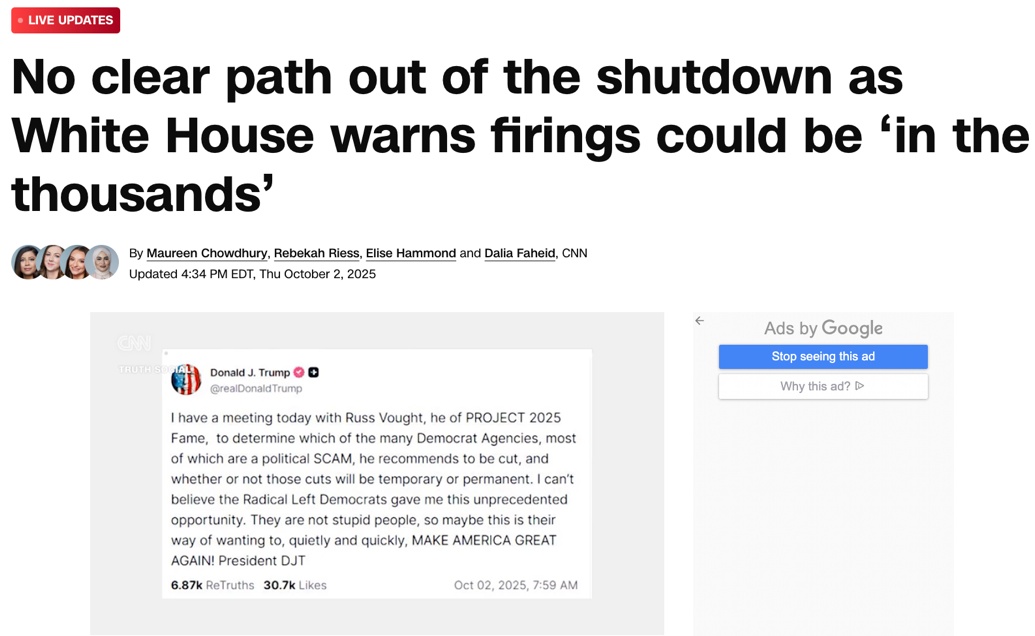 每次停擺,聯(lián)邦雇員都必須無薪休假,士氣受挫。這次更嚴(yán)重的是,特朗普10月2日接受采訪時(shí)表示,可能要進(jìn)行裁員和項(xiàng)目削減。而白宮管理和預(yù)算辦公室(OMB)已要求各機(jī)構(gòu)準(zhǔn)備裁員方案,不少人的崗位恐怕將在這次停擺中被永久裁撤。