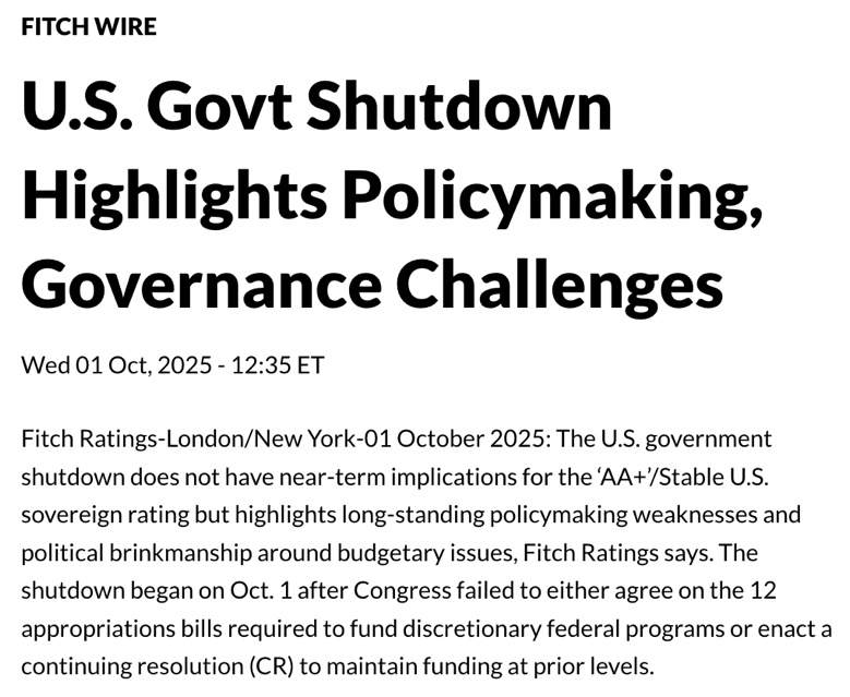 △惠譽(yù)評級官網(wǎng)Fitch Ratings10月1日發(fā)文稱,停擺凸顯了長期的政策制定與治理難題