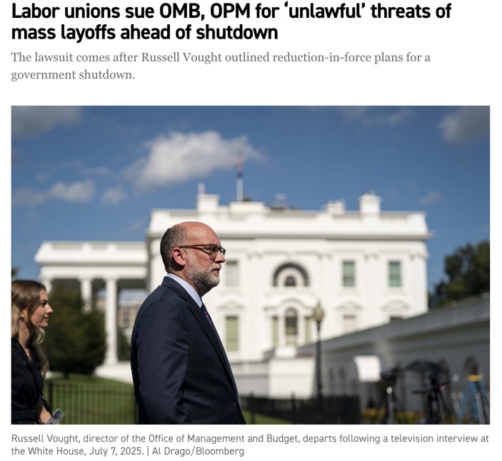 △美國《政治》網(wǎng)站報(bào)道,工會起訴白宮管理和預(yù)算辦公室,稱其在政府關(guān)門前威脅裁員是非法