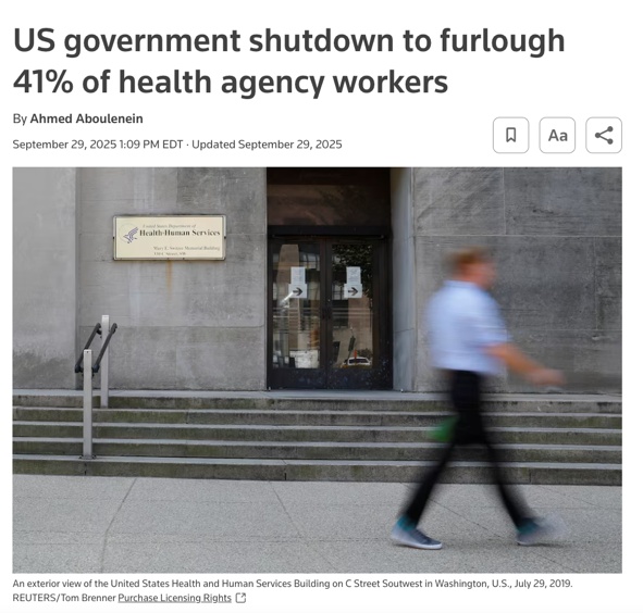 △路透社報(bào)道,由于政府停擺,41%的衛(wèi)生機(jī)構(gòu)工作人員將被迫休假,涉及公共衛(wèi)生資訊傳播、部分醫(yī)學(xué)研究、承包商監(jiān)督等