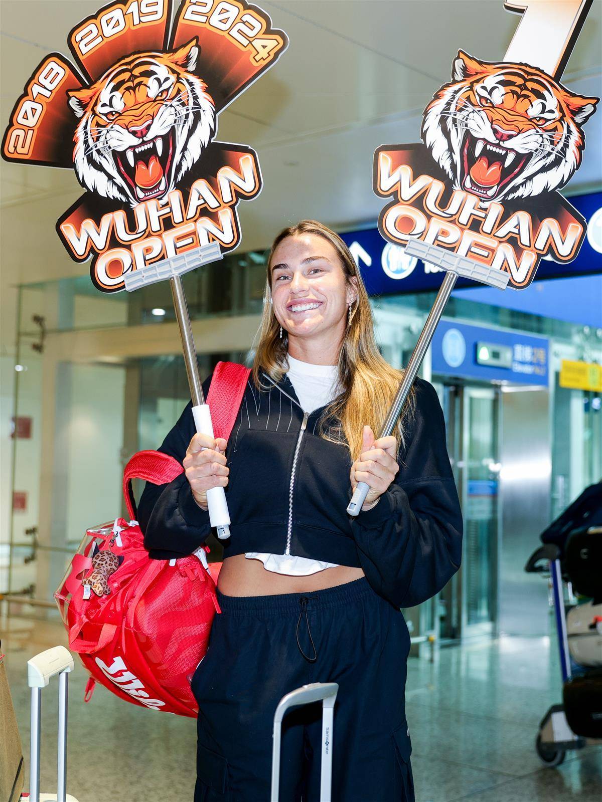 “虎妞”薩巴倫卡抵達武漢,開心地舉起虎頭。