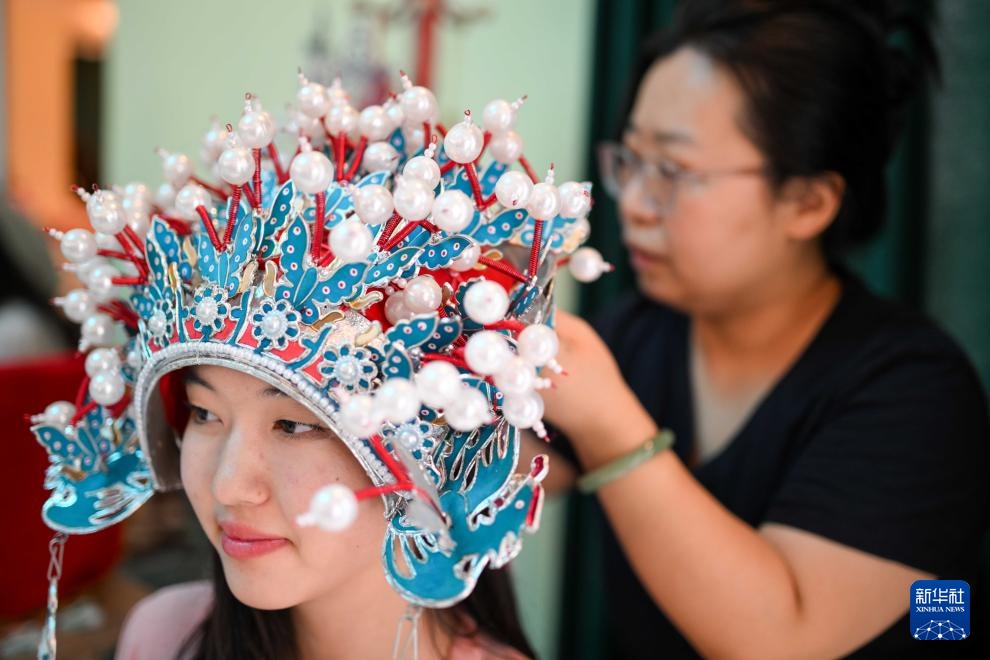 9月18日,在吉爾吉斯斯坦奧什國立大學孔子學院,一名教師為學生佩戴晚會活動上用的頭冠。新華社記者 李任滋 攝