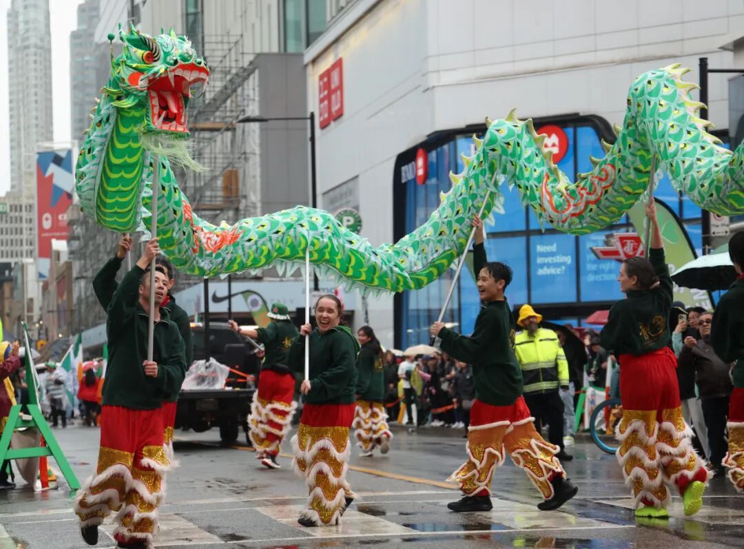 當地時間2025年3月16日,加拿大多倫多,在慶祝愛爾蘭民族傳統節日圣帕特里克節(St. Patrick’s Day)的大游行中,一支中式舞龍隊舞動綠色長龍。中新社記者 余瑞冬 攝