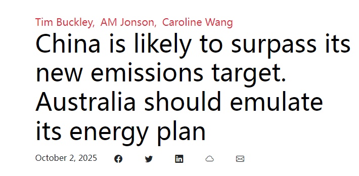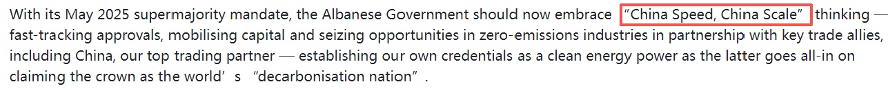 文章說,澳大利亞政府近期也公布了2035年減排目標。澳大利亞能源部長克里斯·鮑文推出的35億澳元“家庭電池補貼計劃”已安裝超6萬套儲能系統,證明政策驅動的轉型潛力。分析認為,澳大利亞政府應借鑒“中國速度”,加快審批流程、撬動民營資本,并在零碳產業領域深化與最大貿易伙伴——中國的合作,以確立澳大利亞在清潔能源領域的競爭力。