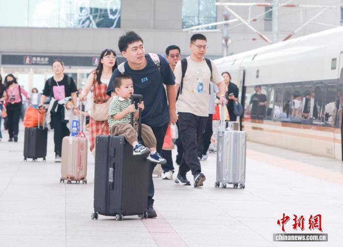 10月1日,國慶中秋假期首日,家長帶著孩子在北京北站乘車。當日,中國鐵路迎來國慶中秋假期客流最高峰,預計發送旅客2300萬人次,計劃加開旅客列車2106列。中新社記者賈天勇攝
