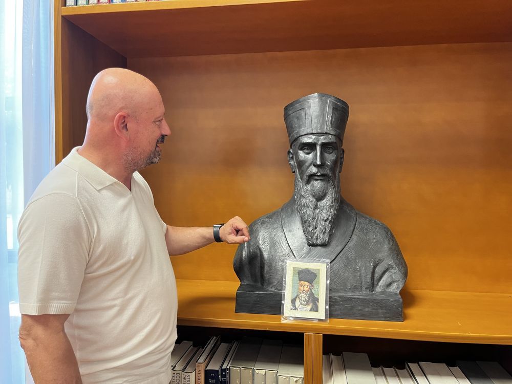 7月4日,在意大利馬切拉塔,利瑪竇國際基金會主席達里奧·格蘭多尼(中文名:高達理)介紹利瑪竇雕像。新華社記者李彥南攝